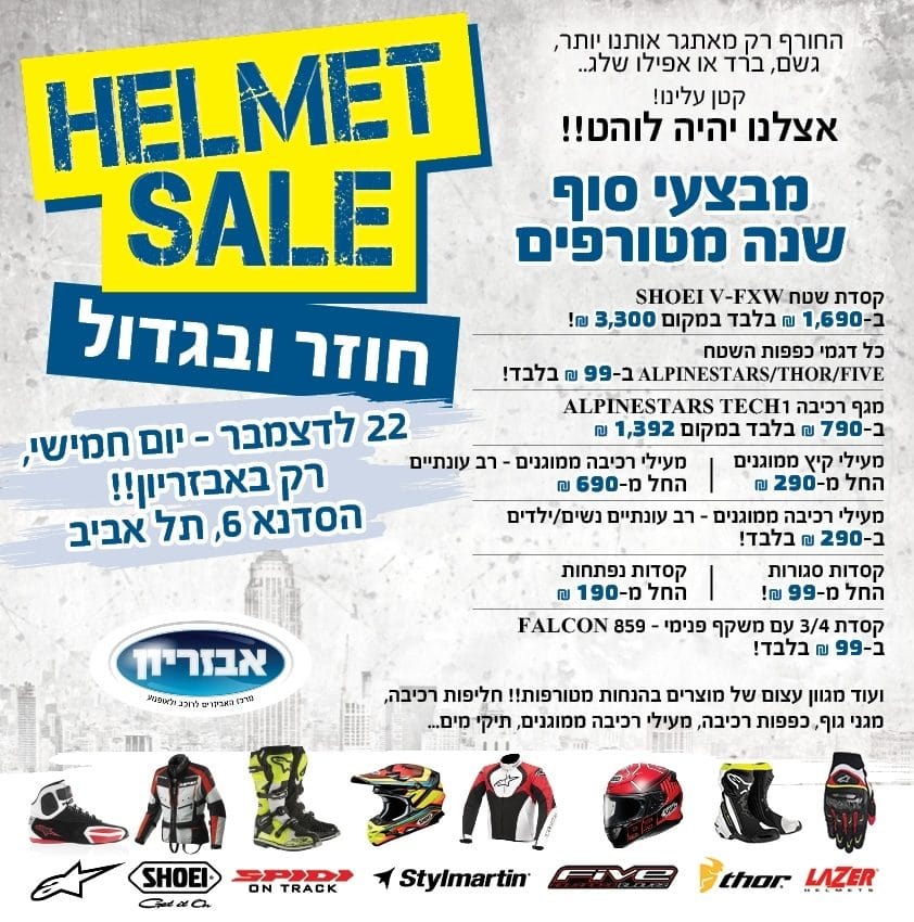 רשת אבזריון מודיעה על מבצע סוף שנה במהלכו יוצע ציוד רכיבה במחירים אטרקטיביים למדי. האירוע ייערך ביום חמישי הקרוב (22.12.16) בין השעות 16:00 ל-22:00 בסניף הראשי של אבזריון (הסדנא 6 תל אביב). כן, חמש שעות בלבד.