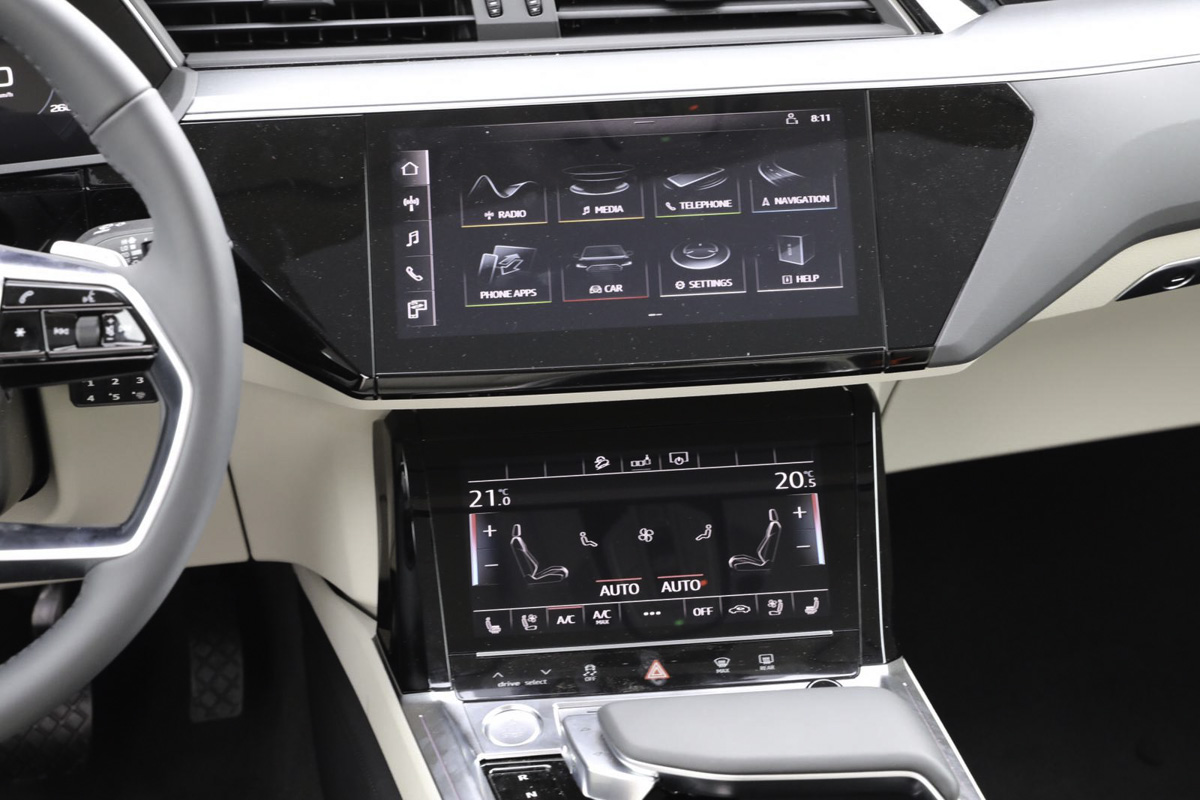 אודי אי-טרון נראה מרשים למדי בסביבה נורמלית ולא על במה רחוקה. אלמנטים עיצוביים אופיניים של היצרנית נמצאים כאן, הממדים מציבים אותו בין Q5 הגיונית ל-Q7 אדירת הממדים. המפרט מרשים מעבר לשני המנועים האמורים, וההנעה הכפולה הטבעית (ומנוהלת המחשב כמובן) שנוצרת ממיקומם, עושה רושם שרשימת האבזור כוללת הכל. כבר מגרסת הבסיס (392,500 שקלים) מקבלים אבזור נוחות ובטיחות מלא. הרשימה ארוכה מאוד וכללת חישוקי 20 אינץ', בקרת אקלים קוקפיט וירטואלי, מערכת בטיחות מתקדמת מלא ועוד. חבילת פרימיום (תוספת של 30,000 שקלים) מוסיפה אפילו יותר אבל העניין הבולט ביותר הן המראות הוירטואליות – שתי מצלמות המחליפות את המראות המקובלות ומקרינות את הנעשה מאחור על מסכים בגופן הדלת.