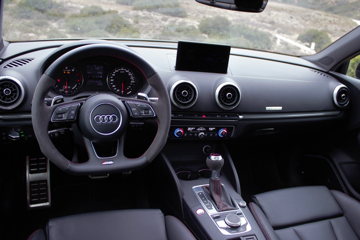 גם תא הנוסעים נותר כמעט זהה לחלוטין. מעתה יש תאורת ״אודי ספורט״ על הרצפה כשפותחים את הדלתות ובהגה החליפו את מיקום העור והאלקנטרה, כך שאם לפני מתיחת הפנים העור היה בצידי ההגה (איפה שאמורים לאחוז אותו) עתה שם יש את האלקנטרה. ציפיתי לקבל כאן את הקוקפיט הוירטואלי, אבל אודי RS3 מגיעה עם לוח השעונים המסורתי שאומנם נראה איכותי ויוקרתי אבל אינו מרשים כמו אחיו העדכני.