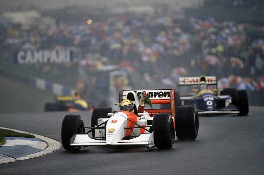 בזינוק סנה נדחק למקום החמישי, אבל זה היה באמת רק לרגע. אחרי שבריר שניה הוא היה כבר רביעי שוב. אחרי שתי פניות הוא עולה למקום השלישי. כמה שניות אחר-כך סנה עוקף את דיימון היל ומתייצב במקום השני. הבא בתור היה פרוסט. זהו, ממקום חמישי למקום ראשון בהקפה אחת.