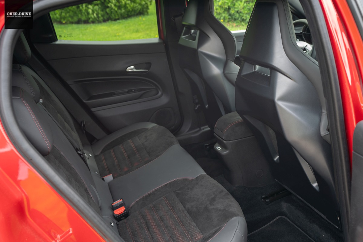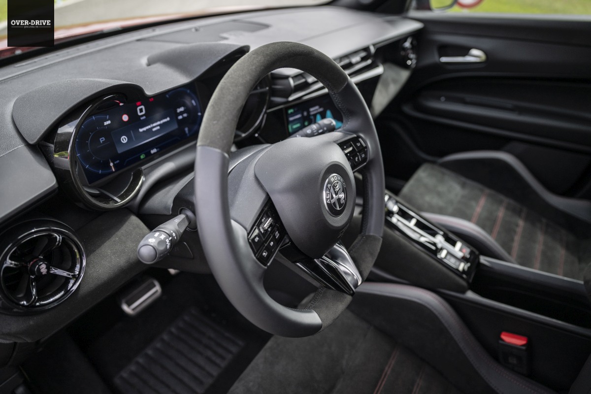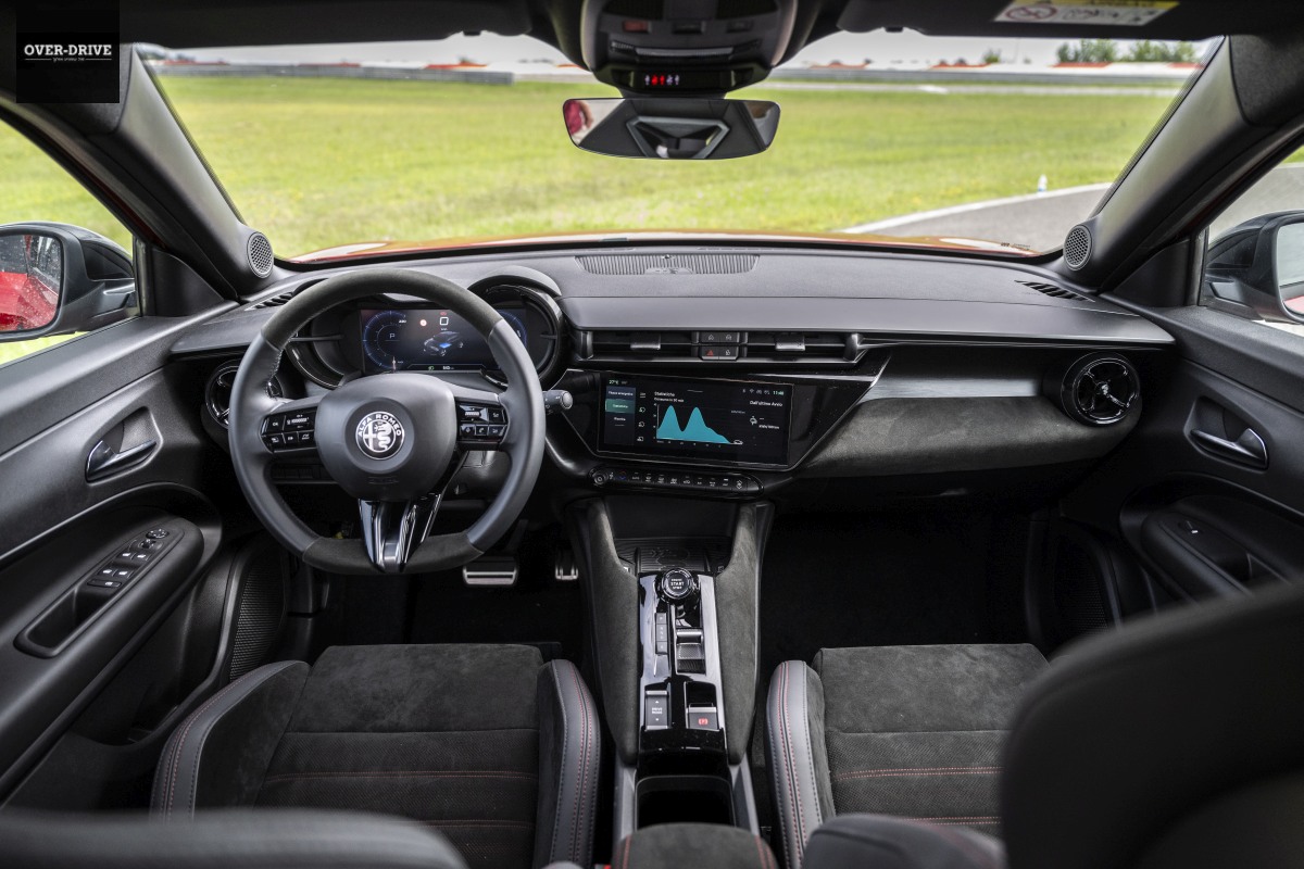 ישנם שני האלמנטים מהותיים כאן. הראשון הוא שהכוח מחולק בין הגלגלים הקדמיים על ידי דיפרנציאל מוגבל החלקה (טורסן). זה נדיר בלי קשר לכל מה שמשווק היום בכלל. לא קיים בשום מכונית חשמלית (רק בג'וניור ובאבארט 600 החולקת מכלולים עמה). בפעם האחרונה שאלפא השתמשו בדיפרנציאל מכאני בהנעה קדמית היה בימי ה-147 (Q2). מכונית חשמלית, עם דיפרנציאל מכאני. יופי של רעיון. הסיפור השני כאן הם מצבי ה-DNA. במצב D, היחידי שמעניין אותי כאן, מחדד את פעולת ההגה והדוושה, וגם מבטל את היכולת הרגנטיבית של הבלם לטובת תחושה טובה יותר מהדוושה. עוד משהו שקורה במצב D זה אלחוש ברור מאוד לבקרת היציבות. ניתוק לחלוטין לא אפשרי כאן.