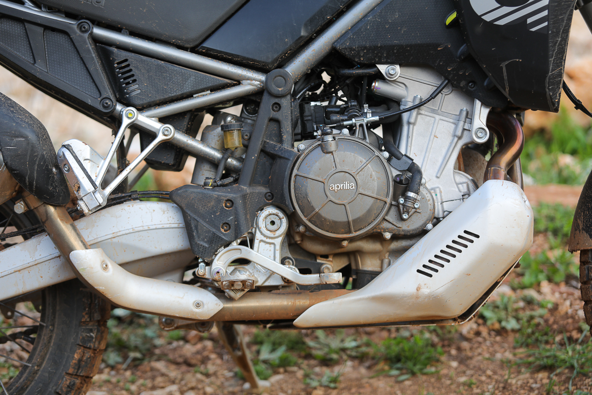 מעבר למנוע שהותאם במיוחד לייעודו כאן, ומציג נתוני הספק מופחתים, וגמישות משופרת שמתאימה יותר לקהל בקטגוריה. השלדה עצמה חסונה לפי אפריליה תוך התחשבות בכאלו שיירצו לרכוב בזוג, עם שלושה ארגזים גדולים ועמוסים מאחור. להבדיל מאחיו המנוע כאן מוחזק בשלדה בשש נקודות עיגון (לעומת שלוש). עוד פרט ששווה לציין כאן הוא מיקום מיכל הדלק. המקום המסורתי הגבוה יחסית בו ממוקמים מיכלי הדלק של אופנוע אדוונצר, למעשה מכיל בטוארג תיבת אוויר גדולה המזינה את המנוע. תחתיו מצוי המיכל, מבלי שהרוכב ידע על כך. היתרון ברור, ומציע מרכז כובד נמוך, החשוב לתחושת השליטה בכביש ובשטח.