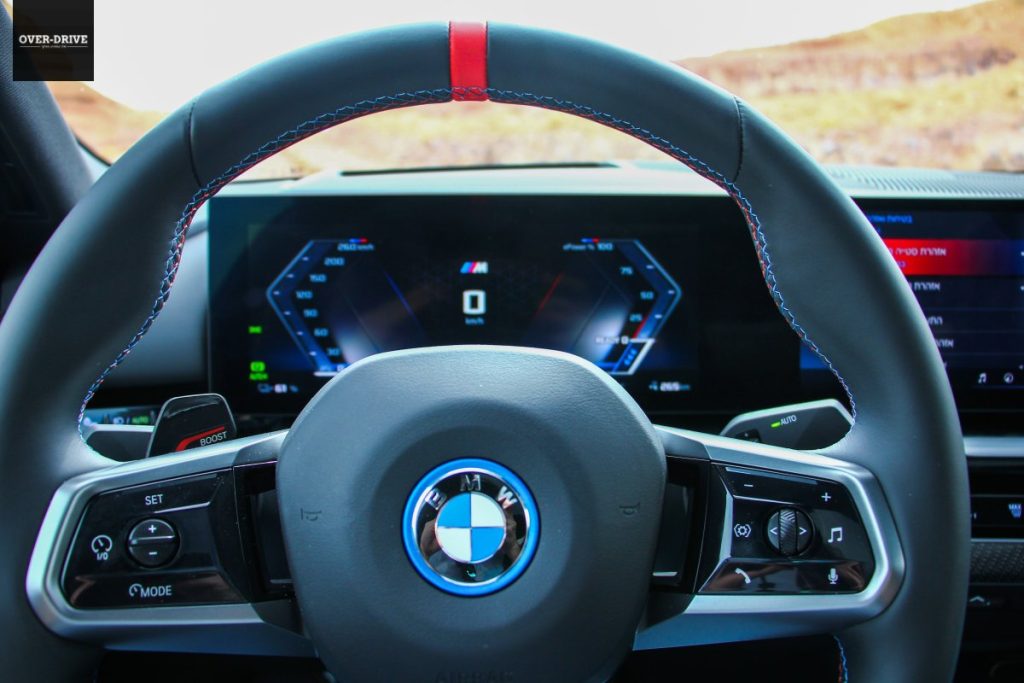 כמקובל כיום המסכים מקבלים תשומת לב יתרה, ובמקרה של ה-i5 מדובר ב-12.3 אינץ' ללוח המחוונים, 14.9 אינץ' לצג המרכזי הצמוד לו הנמתח לרוחב תא הנוסעים, ומופנה קלות לכיוון הנהג כמיטב המסורת, לצד תצוגה עילית מרשימה. המסך המרכזי מאפשר שליטה באמצעות מגע במגוון אופציות, לא כולן נגישות בקלות, אבל תודה למהנדסים של ב.מ.וו שהשאירו מתגים לגישה מהירה בקונסולה המרכזית וחוגה מרכזית בטיחותית בהרבה. איכות החומרים, ברמה הגבוהה ביותר, אם כי היינו מעדיפים לוותר על גימור פלסטיק שחור מבריק במרכז הקונסולה שלא משכנע, בטח ברמות המחיר הללו. רכב המבחן הגיע ברמת גימור M שמוסיפה גלגל הגה בשרני להפליא ומושבים מצויינים ועתירי כיוונונים שיודעים לתמוך היטב כשתזדקק להם. ואתה תזדקק.