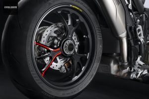 עם קאליפרים רדיאלים בעלי 4 בוכנות מתוצרת ברמבו. לבסוף, סוללת ליתיום קלה במקום במצבר סטנדרטי עוזרת לחסוך עוד 3 ק"ג נוספים.