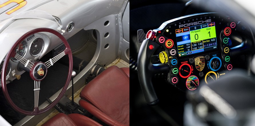 פורשה בוחנים את גלגל ההגה והתהפוכות שהוא עבר בעשורים האחרונים מבחינתם. נקודת המבט שלהם, תקפה בשינויים כאלו אחרים גם לאסכולות מרוצים אחרות וגם לרכבים סדרתיים. הם מציינים כדגומה את גלגל ההגה הפשוט, של פורשה 917, שרשמה לעצמה, בין השאר, שני ניצחונות בלה-מאן. בלי שום כפתור על ההגה…