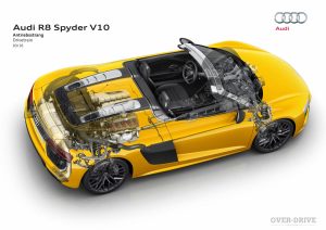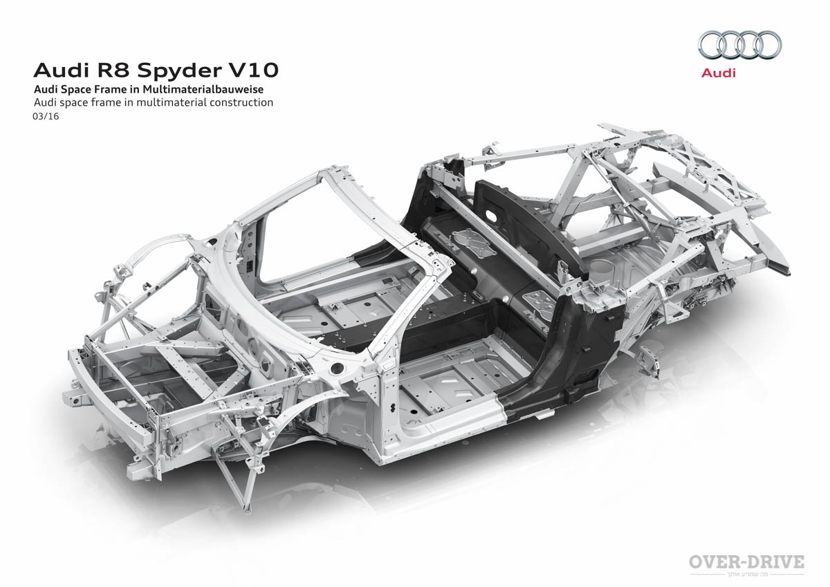 ה-R8 מכילה בתוכה בעיקר אלומיניום וקרבון – חומרים קלים וחזקים – במטרה להשיג קשיחות מבנית טובה (שתמיד בעייתית בלי גג) לצד משקל נמוך. לפי הנתונים ה-R8 ספיידר החדשה קלה יותר מקודמתה ב-113 ק"ג ומשיגה שיפור של 50 אחוזים בעמידות נגד פיתול. המשקל הכולל של הספיידר עומד על 1612 ק"ג, כבדה יותר ב-125 ק"ג מגרסת הקופה – על הפוזה צריך לשלם.