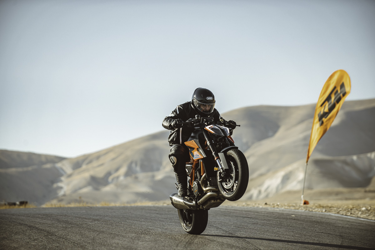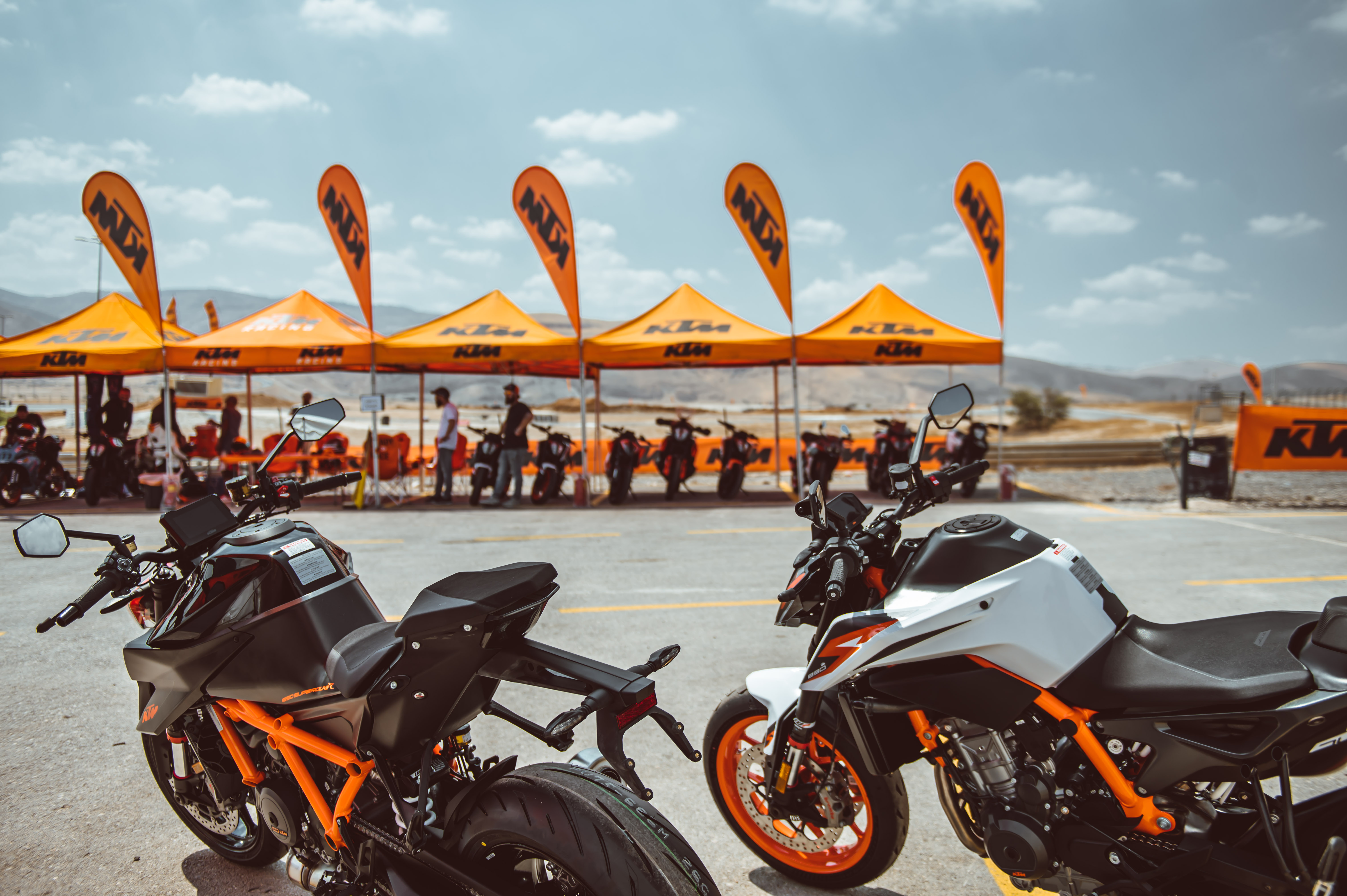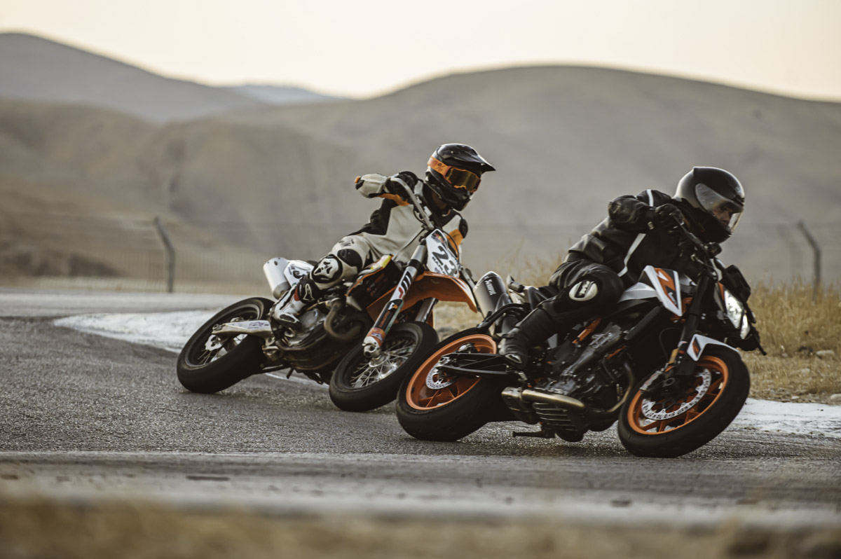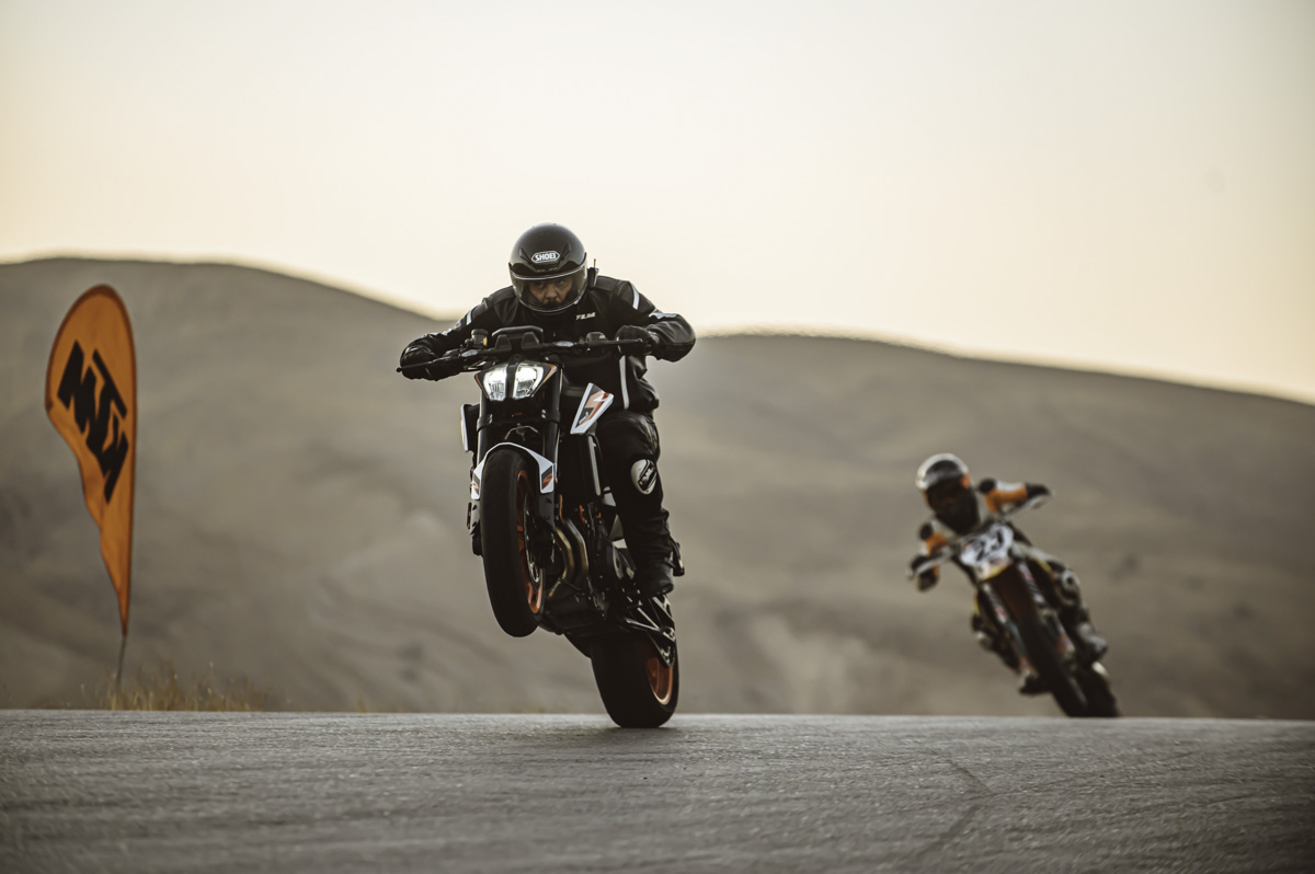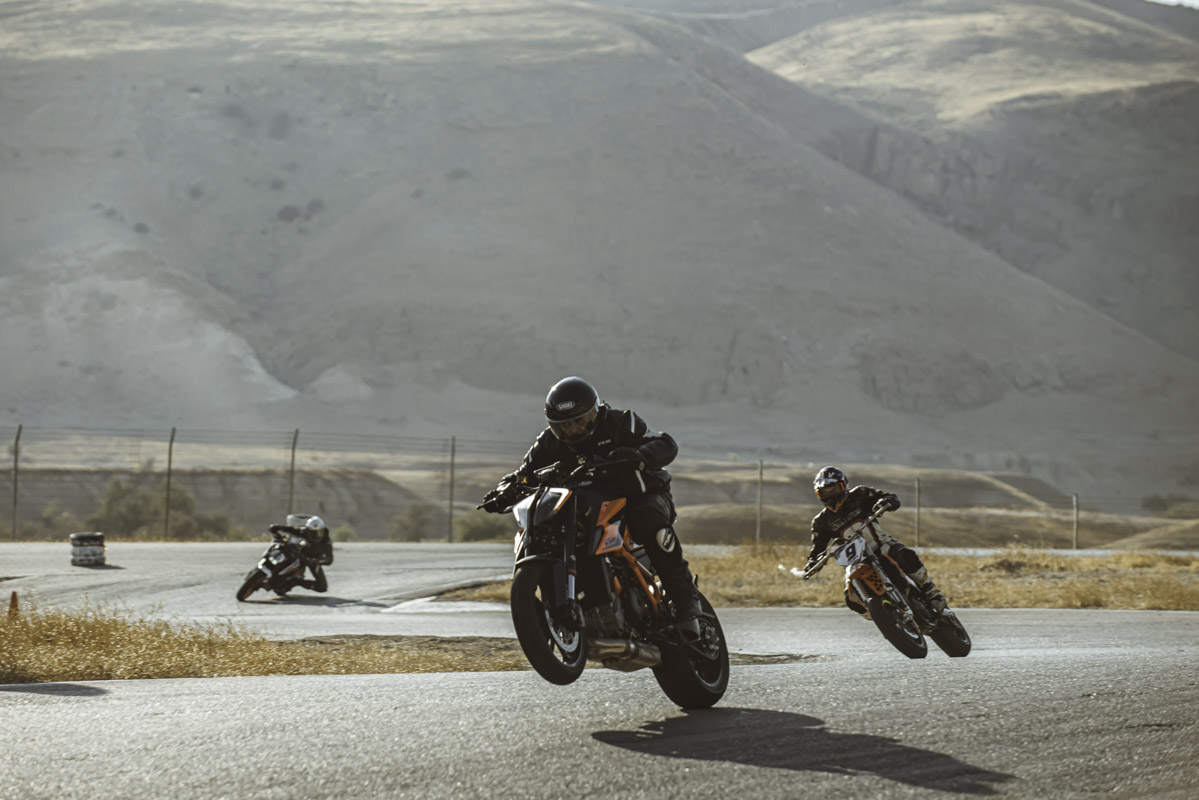 ק.ט.מ הביאו שני 890 בתוליים ו-1290 דנדש לכבוד האירוע. ולידם בפיטס כל אופנוע הדגמה אחר שנח באולם היבואן. חבר את זה לחום האדיר בבקעה, לקולגות שלא תמיד יודעים איפה עובר הגבול ולעובדה שמדובר בכלים כוחניים למדי, ותסכים איתי – ביצים גדולות.