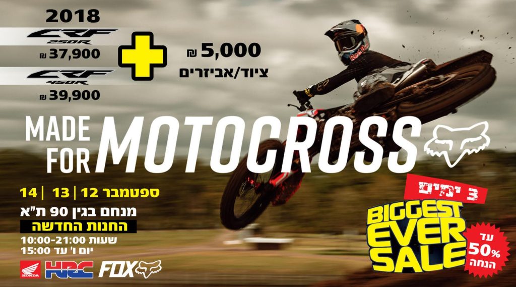 חברת פוקס משיקה חנות חדשה של מותג השטח Fox Head. האירוע יתבצע בשיתוף פעולה עם הונדה ישראל אשר יציגו למכירה במבצעים את דגמי 2018, אנדורו ומוטוקרוס בהנחות לחיסול המלאי. לדוגמא: CBR250R , דגם 2018 ב- 37,900 ש"ח ובנוסף 5000 ש"ח בציוד של פוקס או CBR450R, 2018 ב-39,900 ש"ח ובנוסף 5000 ש"ח בציוד של פוקס.