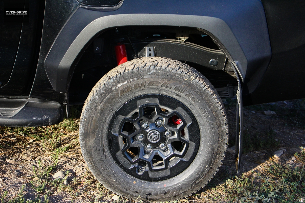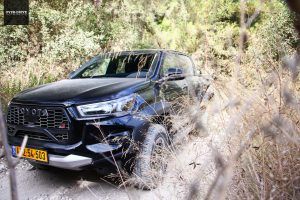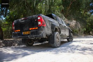 כאמור מפשק הסרנים וזוויות המרכב שופרו, ואליהם מצטרפים בולמי זעזועים וקפיצים משופרים שגם נראים מצויין כיוון שהם צבועים באדום. גם כאן התוצאה השאירה אותנו בתחושה מעורבת. המתלים נותרו נוקשים למדי וזה מורגש בכל שביל זרוע אבנים ובורות. יכולת השיכוך רחוקה מהגיהוץ המופתי של הראפטור וגם על הכביש כאשר לא הארגז לא עמוס היילקס GR מזכיר שהוא קודם כל טנדר. בצד השני של המשוואה ניתן להרגיש שיפור ביכולת הריסון של המתלים עם פחות נדנודי מרכב בעיקר מכיוון החרטום. שלא תבינו לא נכון. טויוטה היילקס נותר כלי יעיל וקשוח שיקח אתכם רחוק כשהוא עמוס בציוד גם בשטח טכני בלי למצמץ כשבעת הצורך יש לו הילוך כוח ונעילת דיפרנציאל אחורי. אבל למרות הלוק שלו, הוא רחוק מלהיות ההיילקס של נאסר אל עטיה. גם אם תחליטו שאתם מתחרים בדקאר טויוטה היילקס GR ידע לקפץ על דרופים בשבילים מהירים, הוא קרוב לוודאי ישרוד, הגב שלכם פחות.