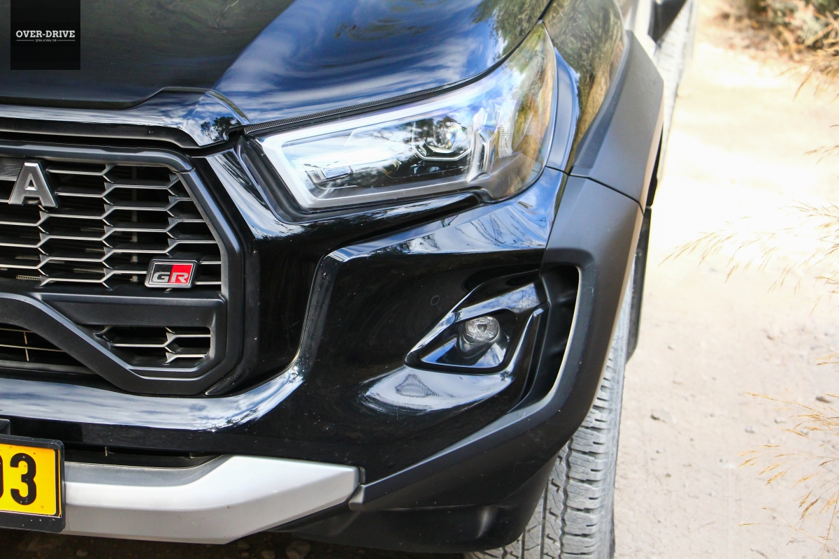 אז מה כוללת חבילת ה-GR ספורט? חיצונית ישנם שדרוגים שעוזרים להיילקס להתנער מתדמית רכב העבודה האפרורי, ולהעניק לו נופך נוסף של קשיחות (כאילו שהייתה חסרה לו כזו). השבכה הקדמית החדשה מודגשת ועם הכיתוב TOYOTA במקום סמל החברה בסגנון טנדרים אמריקאים. הפגוש הקדמי קיבל עיצוב שונה עם, חלק תחתון כסוף הממשיך את מיגון הגחון וגם מאפשר לשפר את זווית הגישה קלות ל-30 מעלות.