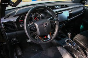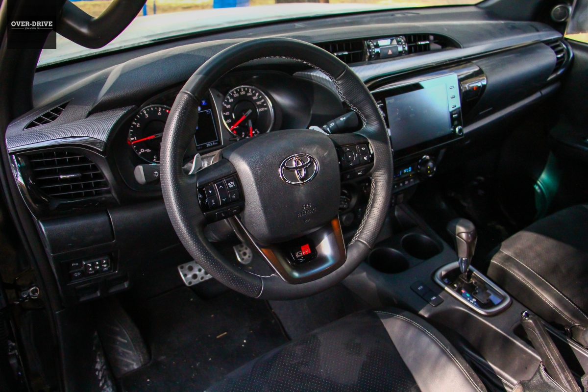 האופי הספורטיבי ממשיך גם לתא הנוסעים. הפלסטיקה אמנם נשארה קשיחה ומגורענת כיאה לרכב עבודה שנועד להזיע ולא להתפנק, אך הוא מעניק תחושה מהודרת יותר בזכות תוספות כמו מושבים עור/אלקנטרה ספורטיביים, חגורות בטיחות אדומות ודוושות אלומיניום, אך מצרף גם דיפון פלסטיק דמוי סיבי פחמן בלוח המכשירים ובדלתות שנראה זול למדי. מעבר לכך ההיילקס נשאר היילקס. בנוי היטב, עם הנדסת אנושברורה ומספק מרווח הגיוני לארבעה נוסעים עם אופציה לדחוס גם נוסע חמישי מזדמן.
