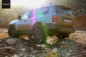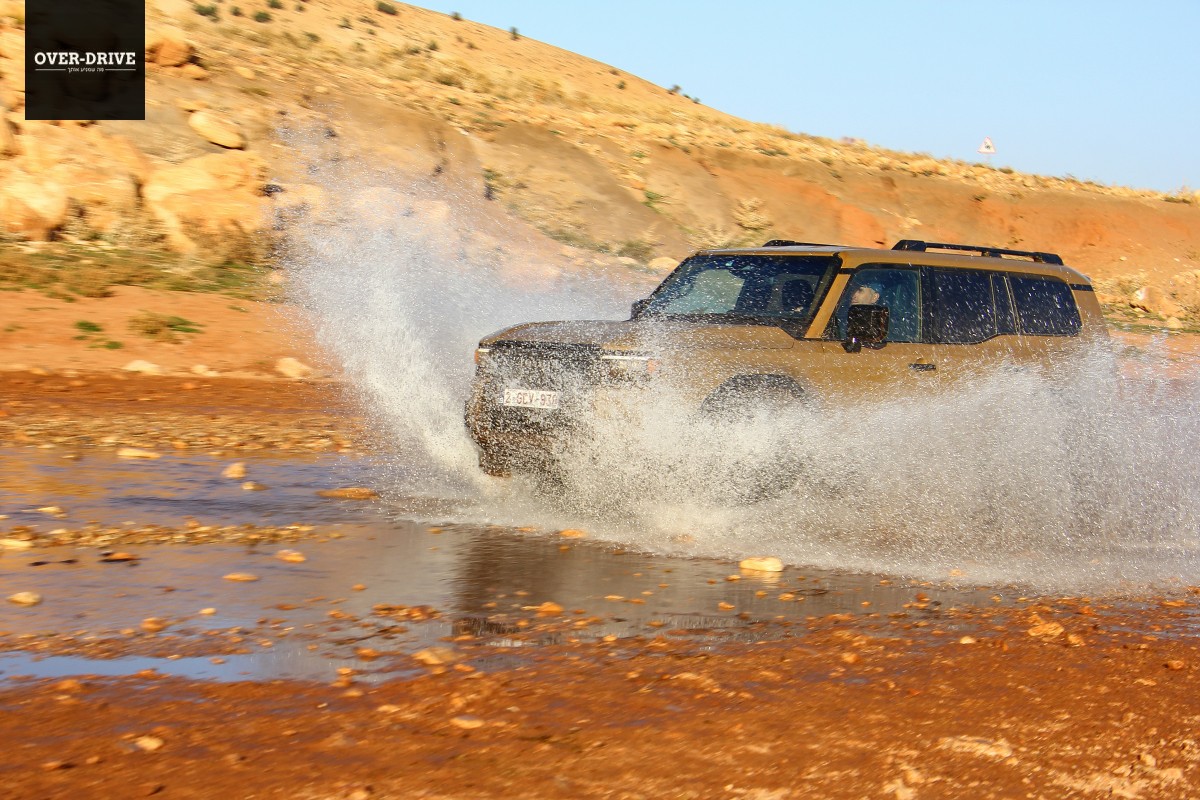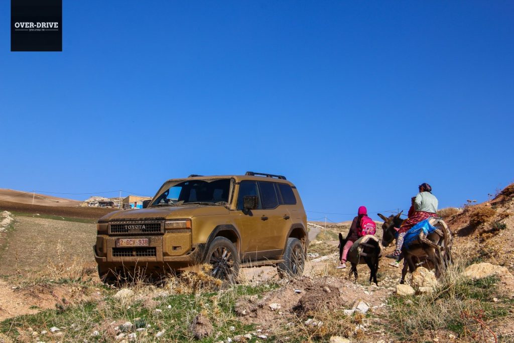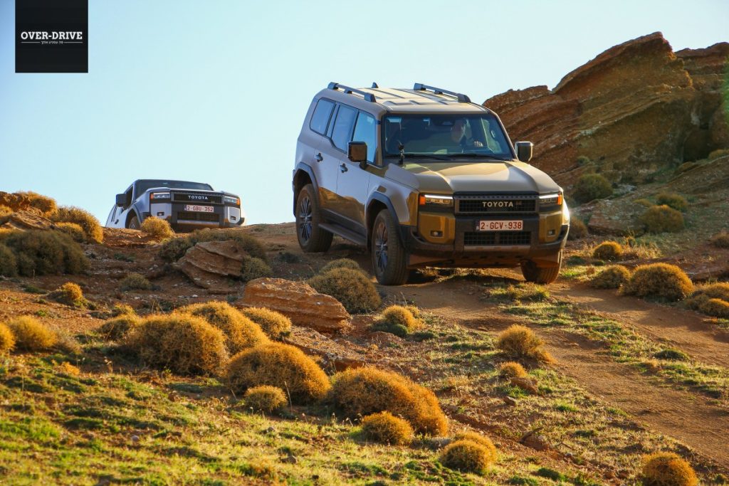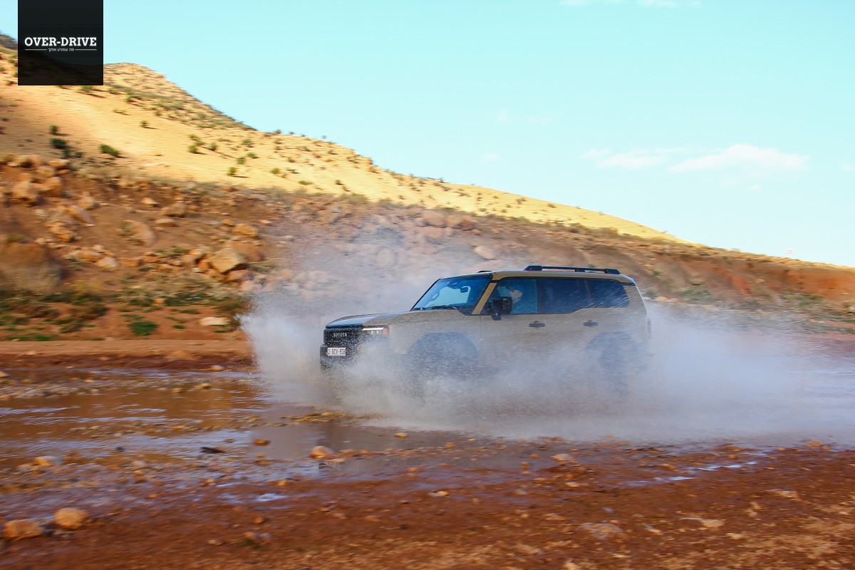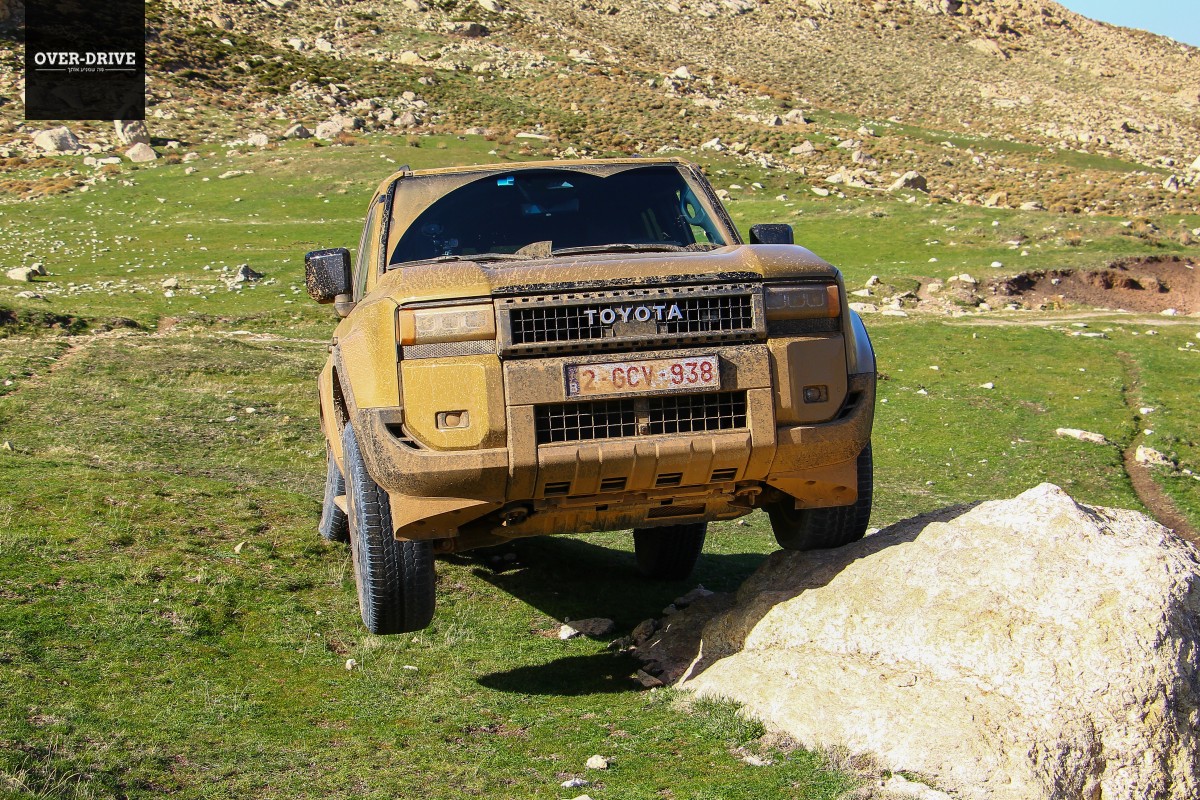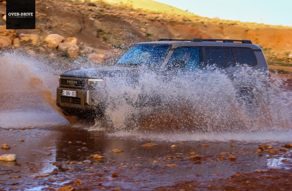 אחרי כמה עשרות קילומטרים יורדים אל השביל המסומן ושוכחים את כל מה ששיננו בהתחלה. יחידת ההנעה בשרנית למדי ומאפשרת ללנד קרוזר לצבור קצב מהיר על השביל המהיר הזרוע אבנים קטנות וגבנוניות. לא אתגר עבור המתלים שמגהצים היטב גם במהירות תלת ספרתית, עד שנתקלים בקפל רוחבי עמוק שמזכיר שבכל זאת יש סרן חי מאחור. קטע הנהיגה הראשון בשטח היה קצר למדי כיוון שהוא הוביל למחנה של טויוטה בין ההרים, שם נתחם מגרש משחקים עם מספר שעשועי עבירות טכניים שנועדו להמחיש את יכולות הלנד קרוזר החדש בטיפוסים, הצלבות וגלישה במורדות.