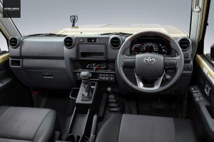 תא הנוסעים עבר גם הוא שינויים קלים ומתבקשים כאשר ישנו לוח מחוונים חדש עם צג דיגיטלי 4.2 אינץ', סידור חדש למתגים בקונסולה המרכזית ומערכת מולטימדיה מודרנית עם תמיכה בממשקי אנדרואיד ואפל,  אך עם מסך צנוע של 6.7 אינץ'. גם בבטיחות לנד קרוזר 70 הקשיש צועד עם הזמן ומציע לראשונה מערכות התרעה על על סטיה מנתיב, זיהוי תמרורי מהירות ותאורת אור גבוה אדפטיבית.
