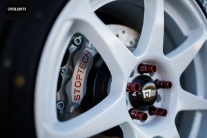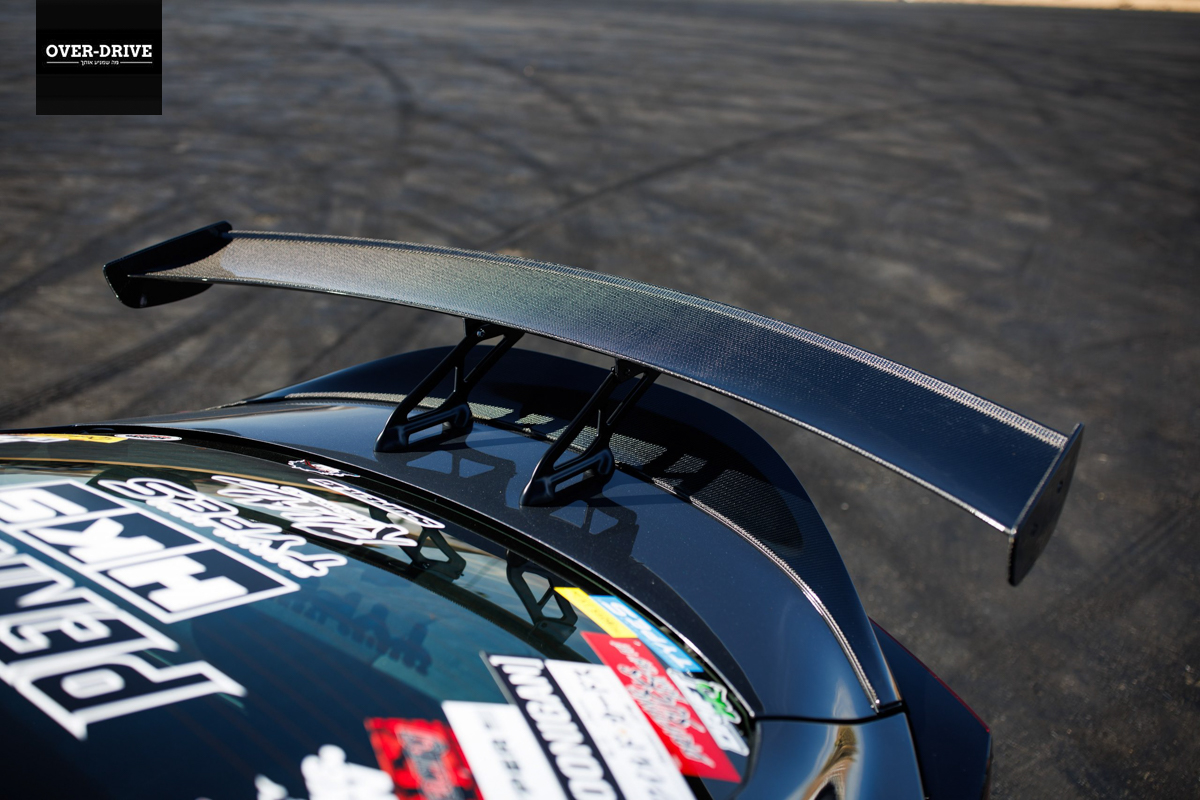 בתוך טויוטה GR86 הזו אפשר למצוא מושבי ספארקו ECO QRT, רתמת ספארקו עם 6 נקודות עגינה וכלוב התהפכות 4 נקודות של סטודיו RSR. ההגה הוחלף ומהלך ידית ההילוכים קוצר עם קיט וכמובן הותקן בלם-יד הידראולי בצורה שמשתלבת יפה בקונסולה המקורית. עכשיו אל לנו לשכוח שצ'ין הוא בחור ויזואלי, צלם אחרי הכל. מכסה המנוע הוחלף במכסה מסיבי פחמן של Seibon, התווספו גם ספוילר אחורי, חצאיות, דיפיוזר וליפ קדמי –  כמובן גם מסיבי פחמן, של HKS. הטויוטה של צ'ן נועלת Motegi Racing MR154 בצבע לבן בקוטר 17 אינץ', עם צמיגים של Yokohama ADVAN NEOVA AD09.  האוטו נעטף במדבקות וכמובן שעל כל הרכב יש מדבקות של יצרנים ומותגים שליוו את הבנייה (כידוע 5 כ"ס למדבקה). גם תאורת הניאון התחתית המחרידה מגיעה משת"פ של הצלם עם החברה שמייצרת אותה.