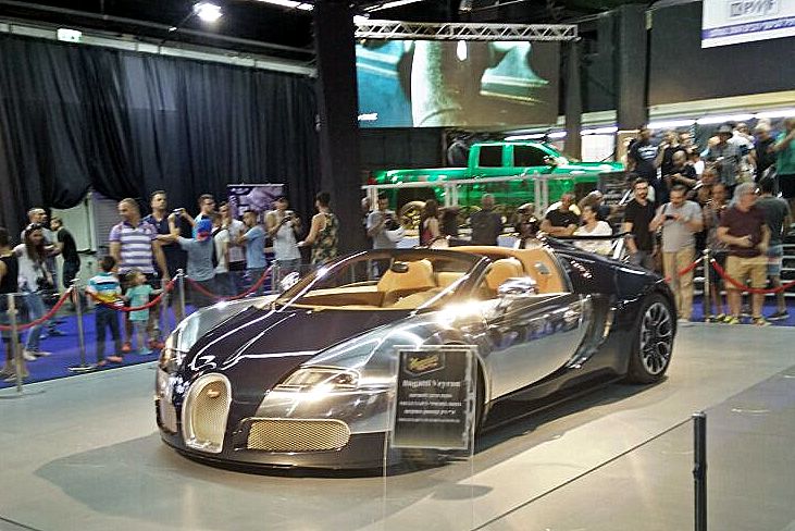 ואז הגענו אל הכוכבת, בוגאטי ויירון גרנד-ספורט שניצבת במרכז האולם, סופגת מטחי פלאשים מבאי התערוכה. כנראה שגם כוכבת זקנה היא עדיין כוכבת. כמה עולה ויירון משומשת? תלוי את מי אתה שואל. מארגני התערוכה לא התביישו להצמיד תג מחיר מופרך ולא קשור לגופה של המכונית המוחלפת. קצת משעשע שבתערוכות בכל העולם מוצגת השירון ואנחנו קופצים על ויירון כמוצאי שלל רב.