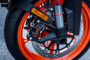 בתחום הבלימה, הדיסקים הקדמיים של ק.ט.מ 990 דיוק R גדלו לקוטר של 320 מ"מ והם נחבקים על ידי קאליפרים רדיאלים בעלי 4 בוכנות מסדרת Stylema של ברמבו. למערכת ה-ABS נוספות מעתה שני מצבי פעולה נוספים לבחירה: סופרמוטו וסופרמוטו פלוס. אלו מצטרפים לחבילת האלקטרוניקה הכוללת בקרת משיכה בעלת מספר מצבי פעולה, בקרת זינוק, מערכת למניעת ווילי וקוויקשיפטר