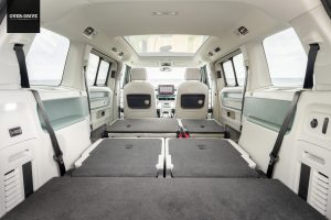 גרסת בסיס הגלגלים הארוך תגיע בתצורה של שבעה מושבים או שישה מושבים שבה שני מושבי קפטן במרכז המכונית. המרווח אמור לספק גם למבוגרים בשורת המושבים השלישית, ומגוון אפשריות קיפול של המושבים מאפשרים ליצור רצפה שטוחה וחלל מטען בנפח של עד 2,469 ליטרים. את החוויה משלימים ברמות הגימור הגבוהות גם גג זכוכית פנורמי גדול יותר, תאורת אווירה מקיפה עם עד 30 צבעים, חימום לשורת המושבים השניה ומערכת שמע של הרמן קרדון. ממש לא הטרנספורטר הסגפן של ההיפים מהסיקסטיז. באותה הזדמנות הוסיפו בפולקסווגן מערכת מולטימדיה עדכנית עם מסך 12.9 אינץ' גדול מבעבר.