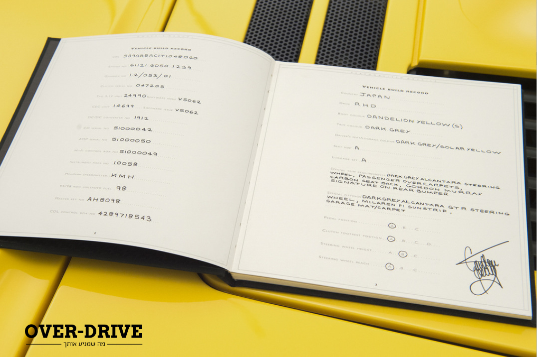 הקונה הבא יקבל את ה-F1 הצהובה הזו עם כל הציוד המלא איתו היא נמסרה. זה כולל מערכת כלים מטיטניום, סט תיקי מטען מקורי, שעון שיוצר במהדורה מוגבלת לבעלי F1 וכמובן כל המסמכים המקוריים. בנוסף הוא יזכה למערכת פליטה חלופית מגרסת ה-LM, גלגל הגה נוסף של גרסת ה-GTR. אפילו את הניילונים והכיסויים שעטפו אותה כשירדה מפס הייצור הקונה המאושר יקבל. חדשה כבר אמרנו?