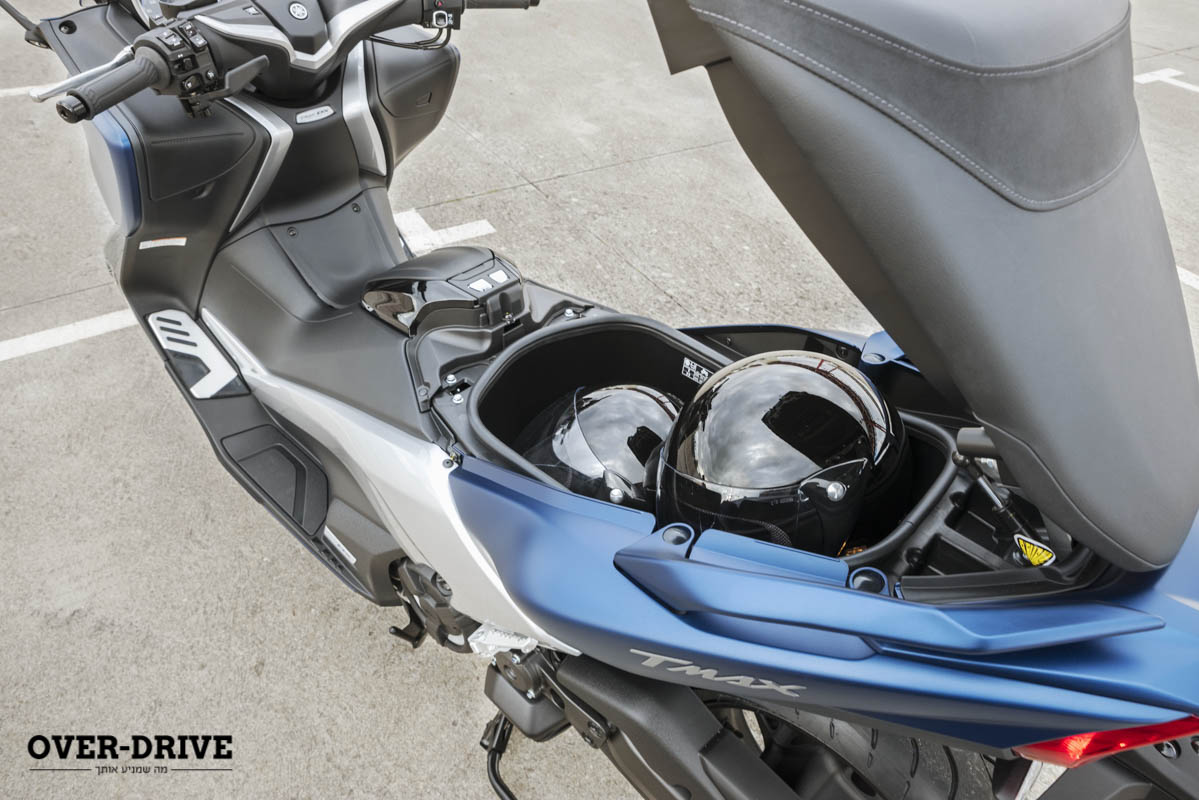 מתחת למושב אפשר למצוא כעת מקום לקסדה אחת מלאה או שתי קסדות שלושת רבעי כשבחזית ישנם תאי אחסון וגם שקע טעינה. ה- TMAX החדש מצויד גם בתפעול ללא מפתח כשחיישן קרבה מאפשר לך לפתוח את תא המטען, פתח התדלוק ולהניע את הקטנוע מבלי הצורך להוציא את המפתחות מהכיס. ויש עוד תוספות אבל בשבילן צריך להגיע ל- TMAX DX.