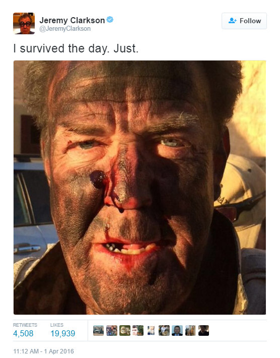 למחרת הוא שיתף את התמונה הזו וכתב: "שרדתי את היום, בקושי". לנו זה נראה כמו איפור כבד ולא כתאונה או פציעה אמיתית אבל כאמור – אין באמת תשובה. אנחנו מהמרים על מתיחה מתוכחמת ל-1 באפריל, היום בו נכתבה ההודעה המדוברת. כשאמאזון יעלו את התוכנית החדשה של קלארקסון בחודשים הקרובים, נדע אולי מה התרחש שם.