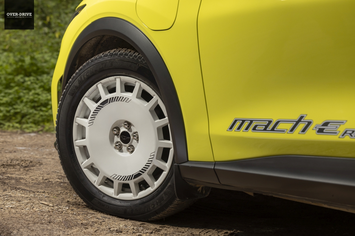 גרסת הראלי מתבססת של המוסטאנג מאך E מתבססת על גרסת ה-GT, שלה צמד מנועים חשמליים בהספק משולב של 480 כ"ס ו-כמעט 90 קג"מ והנעה כפולה בהספק של פורד לא הסתפקו בקוסמטיקה וגם הגביהו את המרכב ב-2 ס"מ לטובת יכולת עבירות משופרת בשבילים, כאשר הבולמים האדפטיביים בעלי השיכוך המגנטי עברו כיול בהתאם לייעוד החדש. הבלמים הקדמיים הוגדלו ל-385 מ"מ וישנם גם קאליפרים מתוצרת ברמבו. להשלמת הקרביות גרסת הראלי משתמשת בצמיגי מישלין CrossClimate2 בעלי פרופיל מוטה קלות לשימוש בשטח, במידה של 235/55.