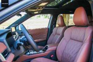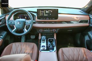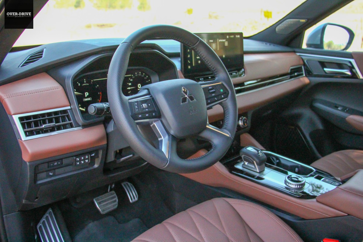 הבשורה בתא הנוסעים מגיעה מכיוון מערכת מולטימדיה חדשה הנפרשת על גבי מסך רוחבי 12.3 אינץ' ומגובה במערכת שמע איכותית מתוצרת ימאהה. הקונסולה שבין המושבים הקדמיים עוצבה מחדש ומשתלבת עם פאנל הפיקוד על בקרת האקלים הנאה למראה ונוח לתפעול. במיצובישי מבטיחים שיפור באיכות החומרים, דבר שמורגש ברמת הגימור הבכירה אותה בחנו עם ריפודי עור רכים בגימור מעוין שממשיכים אל דיפוני הדלתות ומשתלבים לרוחב לוח המכשירים. עם זאת, דווקא תוספת מוצלחת זו מדגישה שאחרי הכל זו מיצובישי, מה שבא לידי ביטוי בדיפוני הפלסטיק הקשיחים והכיסים בדלתות שמרגיש חלול במעט יחד עם מתגים ומנופים שנשארו למזכרת מהדור הראשון של האאוטלנדר.