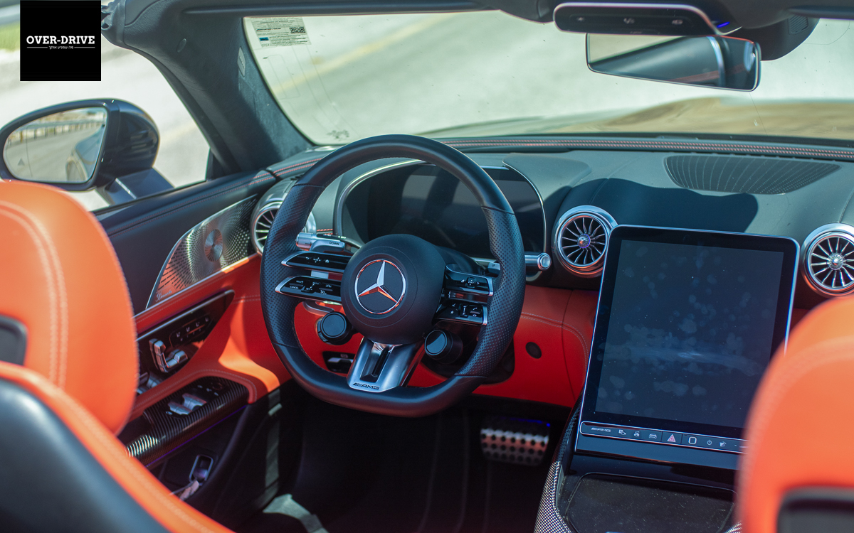 ואם אמרנו גג פתוח, הקיץ כבר כאן. החום בלתי נסבל והשמש מכבידה על מצב הרוח הלאומי ששפוף גם ככה. גג פתוח מתאים לקיץ? במידה ואתה חי באנגליה, לגמרי. אצלנו הזמן הנכון לגג פתוח הוא הדמי-חורף הישראלי. אז הגג נשאר סגור כרגע. גם בגלל החום אבל גם בגלל תשומת הלב שגוררת עימה כל מכונית בתצורה הזו. כשהגג סגור אפשר לשים לב לעבודה היסודית שנעשתה עליו. מרצדס בחרו בכוונה בגג בד עבור הדור האחרון של ה-SL, הורדת מרכז כובד וכיו"ב. מבט מבפנים אל הגג מראה את כמות ההשקעה. המנגנון מוסתר לחלוטין, הכול עשוי לעילא ועטוי חומרים איכותיים ומשלים את האווירה היוקרתית-הייטקית-ספורטיבית בתא. ביצוע מושלם. שאר התא מקבל גם הוא מחמאות באותו הסגנון. הוא עשוי להיראות עמוס בשנייה הראשונה, אבל מהר מאוד אפשר להבין למה מרצדס כיוונו כאן.