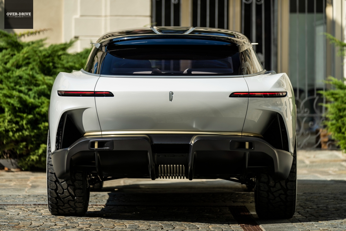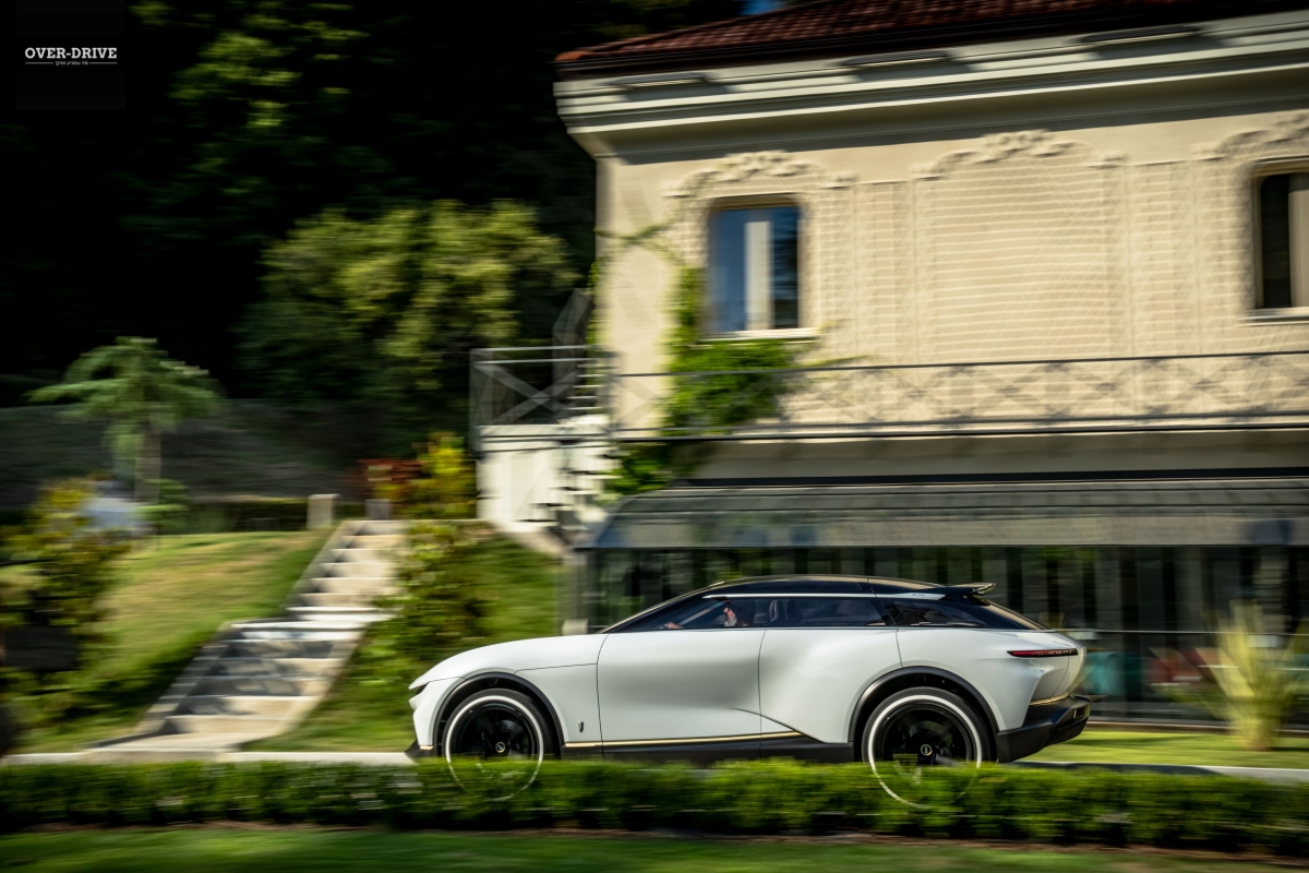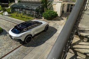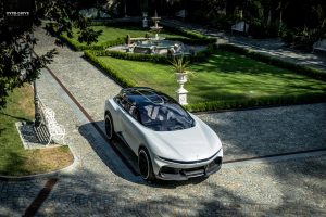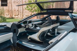 כמעט בכל דגם קונספט ראוותני, גם כאן ויתרו המעצבים על קורה מרכזית ובחרו בפתרון של דלתות הנפתחות באופן מנוגד ("דלתות התאבדות") כאשר החלון המשותף לשתיהן נפתח דווקא כלפי מעלה בסגנון "כנף שחף". למרות שמדובר במכונית חשמלית, תא הנוסעים והשמשה הקדמית משוכים לאחור ומותירים חרטום ארוך יחסית. קו חלונות צד גבוה וחישוקי הענק בגודל "23, מייצרים מראה ספורטיבי. בחירת החומרים והצבעים מספקת גם היא שפת עיצוב חדשנית: חופה בצבע שחור מבריק הכוללת גג פנורמי המשתלבת עם חלקי סיבי פחמן חשופים שהותקנו בפגוש הקדמי.