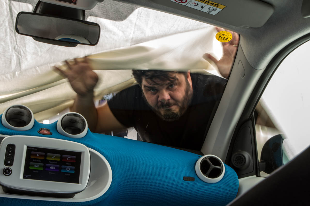 היי, הנה איש מגודל במכונית זעירה. צלם: שחר אלגזי