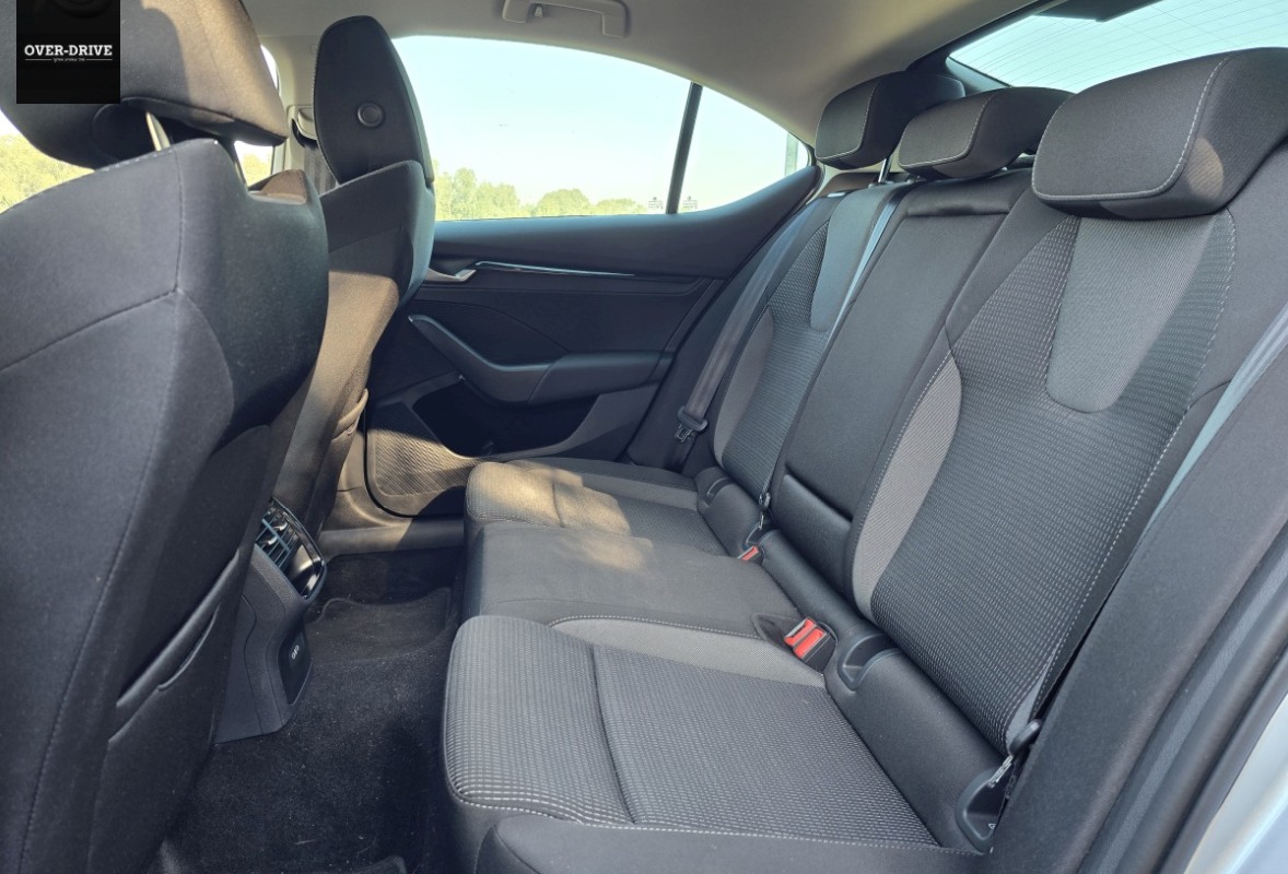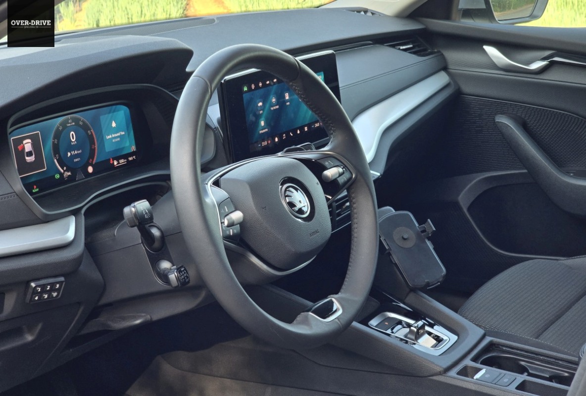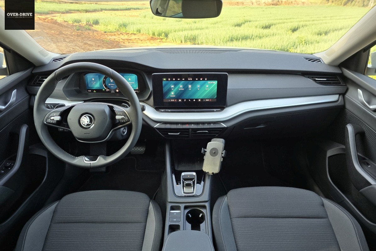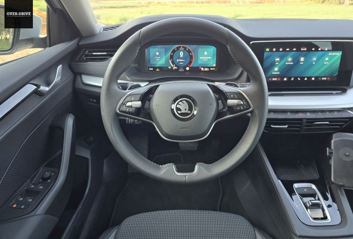גם בתא הנוסעים אין הפתעות מבחינת העיצוב. הסביבה מוכרת, העיצוב שמרני ואיכות החומרים, הגימור וההרכבה ברמה הגבוהה המקובלת בקטגוריה. הבשורה העיקרית היא, איך לא, מסך גדול יותר וממשק מולטימדיה עדכני. מול הנהג גלגל הגה בעל שני חישורים הכולל פקדים נוחים לשליטה, ומאחוריו לוח מחוונים דיגיטלי עם מספר אפשרויות תצוגה. בסקודה שמרו על מספר פקדים פיזיים לטובת גישה מהירה למצלמה האחורית, להגדרות הרכב ולמערכת בקרת האקלים, הנשלטת רק באמצעות המסך. נציין כי עצמת השמע נשלטת באמצעות פס מגע שאינו נוח לשימוש.