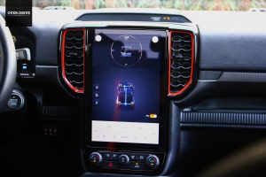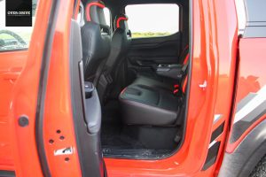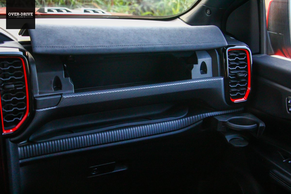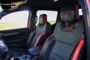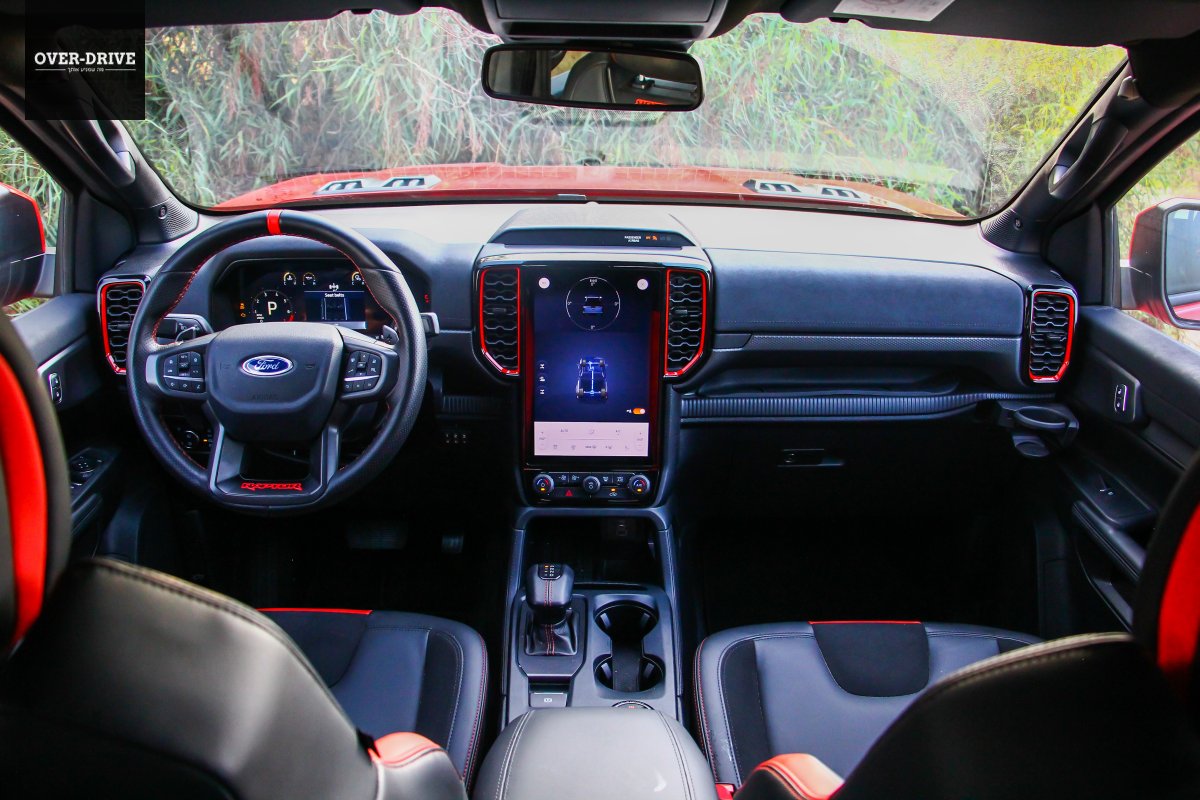 תא הנוסעים די דומה לזה של הריינג'ר הסטנדרטי, וזה טוב כיוון שהוא נראה תכליתי ומודרני, עם לוח מחוונים דיגיטלי מלא עם שפע תצוגת מידע ומסך 12.4 אינץ' אנכי ששולט ברוב מערכות הרכב, כולל בבקרת האקלים, ובסך הכל בעל ממשק אינטואיטיבי ולא מתחכם יותר מידי. מצד שני, למרו ציפוי בד לחלק מלוח המכשירים, אי אפשר להתעלם מהפלסטיקה הקשיחה והגימור הזול דמוי סיבי פחמן באיכות שהיא לא מהטובות שיש לפורד להציע, אבל זה בהחלט מתקבל על הדעת בטנדר. על האווירה הספורטיבית אחראיים גימורים בצבע כתום סביב פתחי המיזוג, גלגל הגה ספורטיבי עם מנופי להעברת הילוכים, דוושות אלומיניום ומושבים ספורטיביים בריפוד עור שחור-כתום שנראים מצויין ותומכים היטב. המרחב במושב האחורי טוב לשני מבוגרים אבל לא הרבה מעבר לכך, בכל זאת, מדובר בטנדר "קומפקטי".