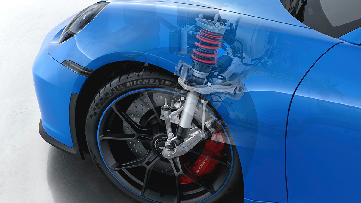 המפשקים כאן רחבים יותר ואפשר למצוא שימוש בעצמות עצה כפולות (לראשונה ב-911) מלפנים. מאחור יש עדיין מתלה רב-חיבור, כאשר פורשה מבצעת כאן גם שינויים והתאמות. זה אומר שלמכוניתה זו אין רכיבי מתלה זהים לאף 911 אחרת כרגע.