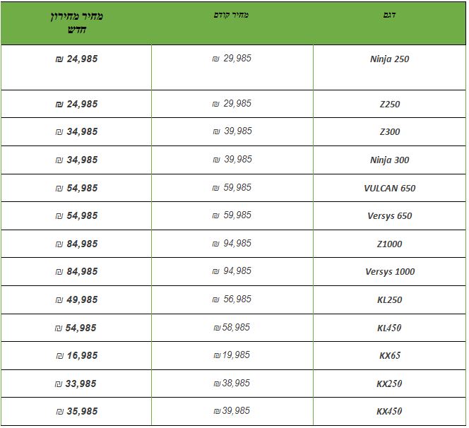 בהודעה שהוציאה קוואסאקי לשוק הישראלי, היא מבשרת על חיתוך מחירים משמעותי לדגמי האופנועים שלה. במסגרת הורדת המחיר קאוואסאקי נינג'ה 300 ו-Z300, יימכרו ב-34,985 שקלים במקום ב-39,985 שקלים, לדוגמה. רוצה עוד דוגמה? הוורסיס 1000 וה-Z1000 יימכרו ב-84,985 שקלים במקום 94,985 שקלים (טבלת המחירים המלאה שצורפה להודעת החברה מובאת מטה).