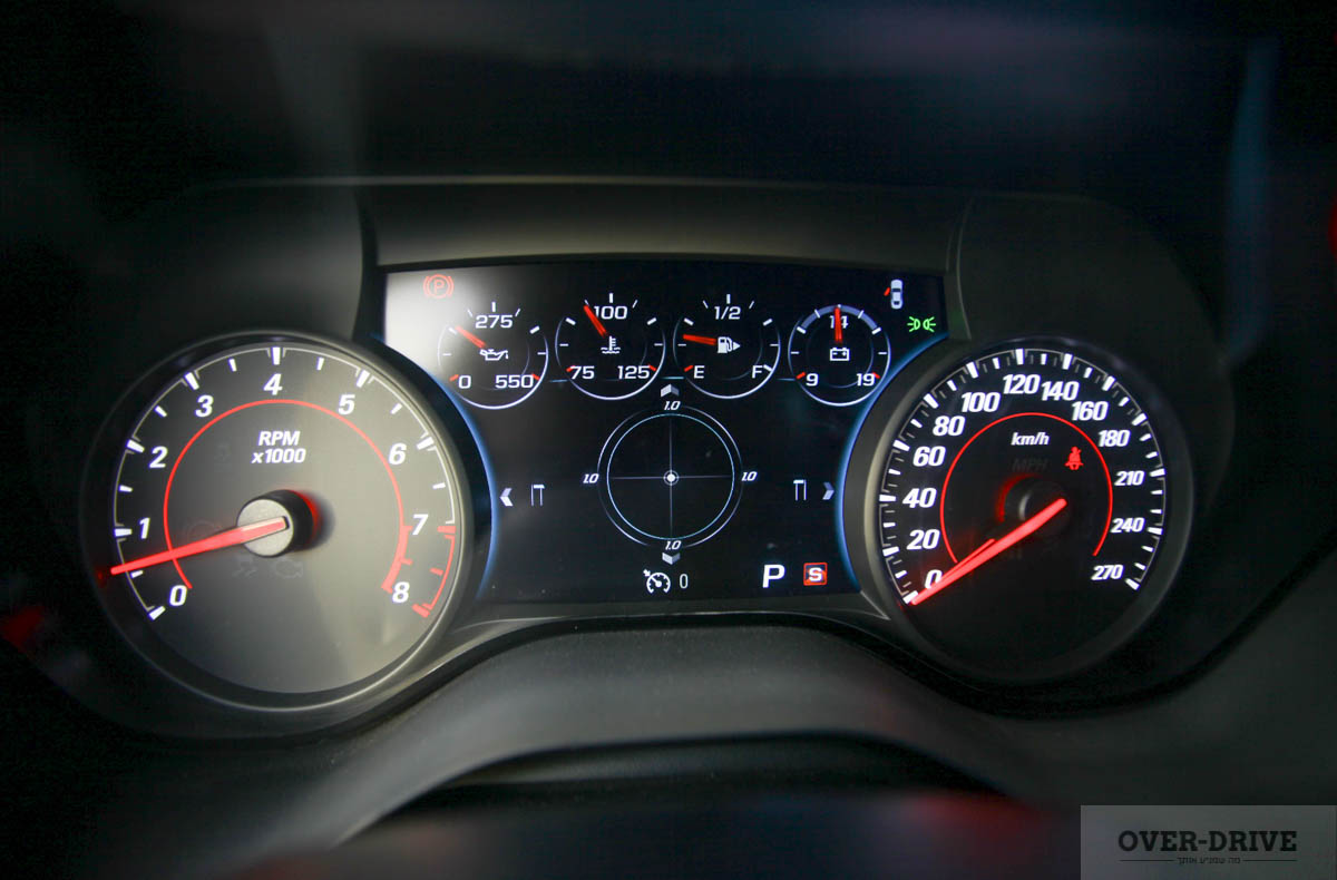 נכנסים לאוטו והתחושה המיוחדת נשמרת. ברור לגמרי שאתה נמצא במכונית עם מטרות ספורטיביות ולא בגרסה ספורטיבית למכונית רגילה. שלא תבין אותי לא נכון, הקמארו משתמשת בפלטפורמת הקאדילק ATS, אבל לפחות 70 אחוז מהרכיבים שונים וייחודיים לקמארו. לוח השעונים עמוס תפריטים ושעונים (כולל מד G, שעון עצר לבדיקת תאוצות ועוד), מושבי העור נראים טוב (אבל לא תומכים מספיק כמו שנגלה עוד מעט) וכשאתה מתיישב תנוחת הישיבה נמוכה, מייצבת אותך בין תעלת ההינע הגבוהה מימין למדרס המצוין לרגל שמאל. הגה קטום נמצא כמעט ניצב אל הנהג והנדסת האנוש טובה כשתלונה אחת נרשמה למתג ההנעה הנחבא מאחורי ההגה. העיצוב החיצוני בולט גם מבפנים – למרות שדה הראיה המצומצם. מכסה המנוע מקומר מול העיניים, תפיחות בתי הגלגלים האחוריים קופצות למראות. יש כאן הרבה עור בפינות אסטרטגיות ורק כשאתה מתחיל למשש אתה מרגיש פלסטיק פשוט למדי בעיקר בחלקו העליון של הדשבורד.