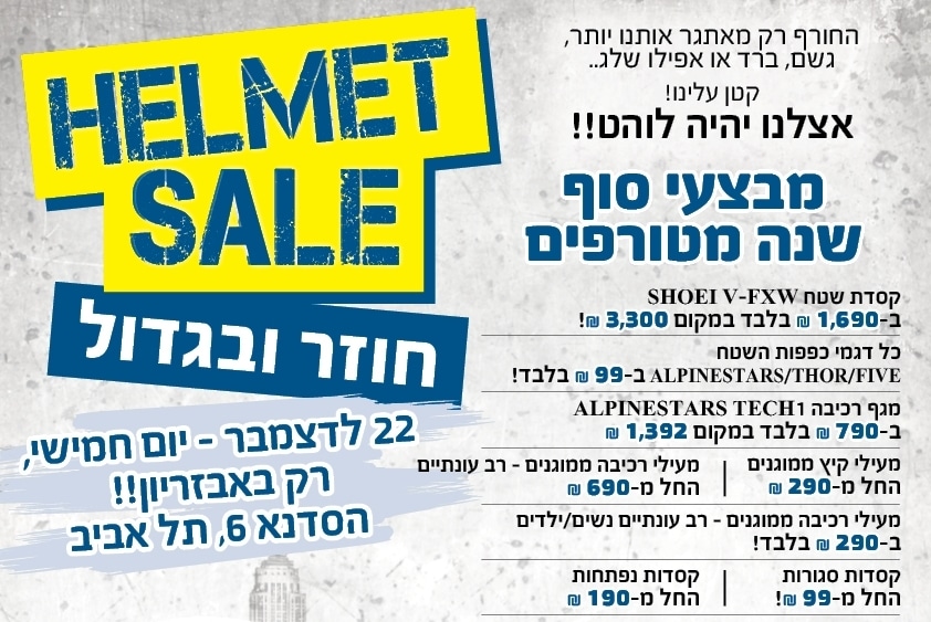 רשת אבזריון מודיעה על מבצע סוף שנה במהלכו יוצע ציוד רכיבה במחירים אטרקטיביים למדי. האירוע ייערך ביום חמישי הקרוב (22.12.16) בין השעות 16:00 ל-22:00 בסניף הראשי של אבזריון (הסדנא 6 תל אביב). כן, חמש שעות בלבד. כנסו לעמוד הפייסבוק שלנו והשתתפו בתחרות הקשורה למבצע הזה – יכול להיות שתזכו במעיל ספידי וכפפות פייב. […]