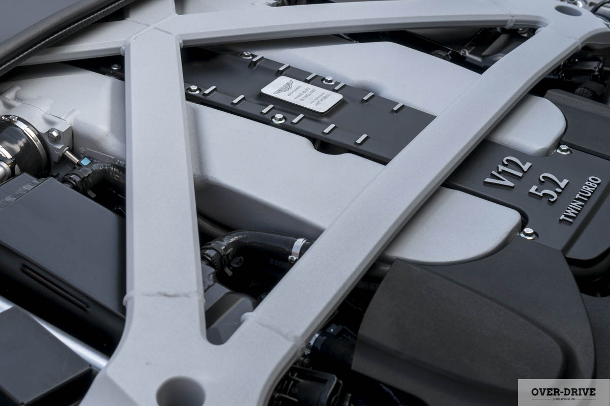 בחזיתה של ה-DB האחרונה יש מנוע. אמיתי. 12 ציל' בתצורת V בנפח 5.2 ליטר עם שני מגדשי טורבו. יחידת הכוח הזו מוציאה 608 כ"ס ו-71 קג"מ. נתון ההספק הופך אותה למכונית החזקה ביותר בסדרת ה-DB מאז ומעולם.